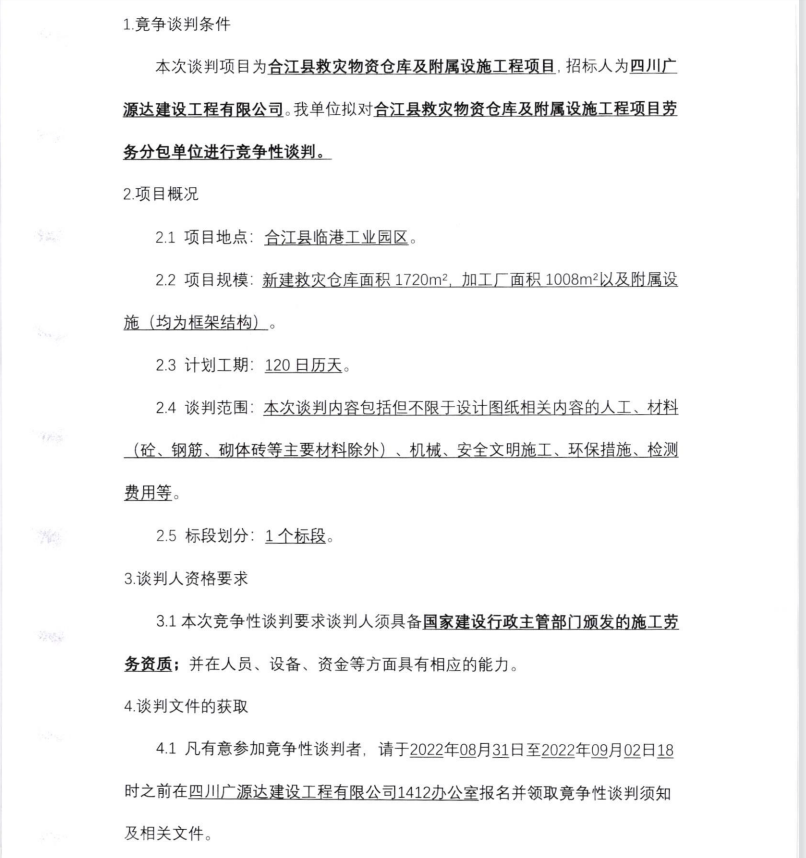 合江縣救災(zāi)物資倉(cāng)庫(kù)及附屬設(shè)施工程項(xiàng) 目 勞務(wù)分包單位競(jìng)爭(zhēng)性談判的公告