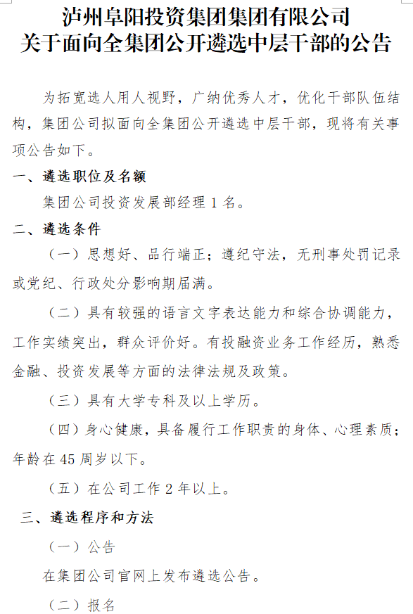 瀘州阜陽(yáng)投資集團(tuán)集團(tuán)有限公司關(guān)于面向全集團(tuán)公開(kāi)遴選中層干部的公告
