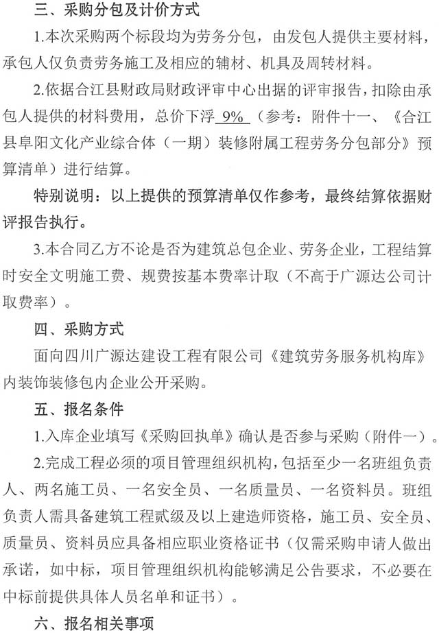 采購公告:四川廣源達建設(shè)工程有限公司阜陽文化產(chǎn)業(yè)綜合體(一期)裝修附屬工程勞務(wù)分包企業(yè)采購公告(第二次)