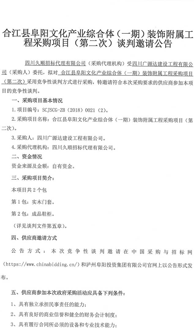 合江縣阜陽(yáng)文化產(chǎn)業(yè)綜合體(一期)裝飾附屬工程采購(gòu)項(xiàng)目(第二次)談判邀請(qǐng)公告.docx
