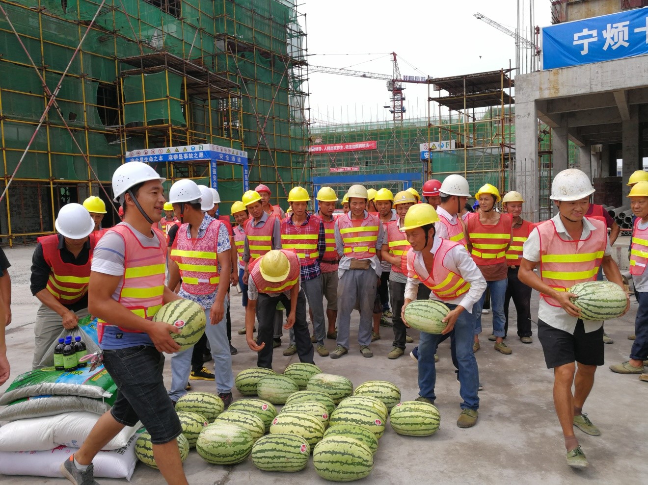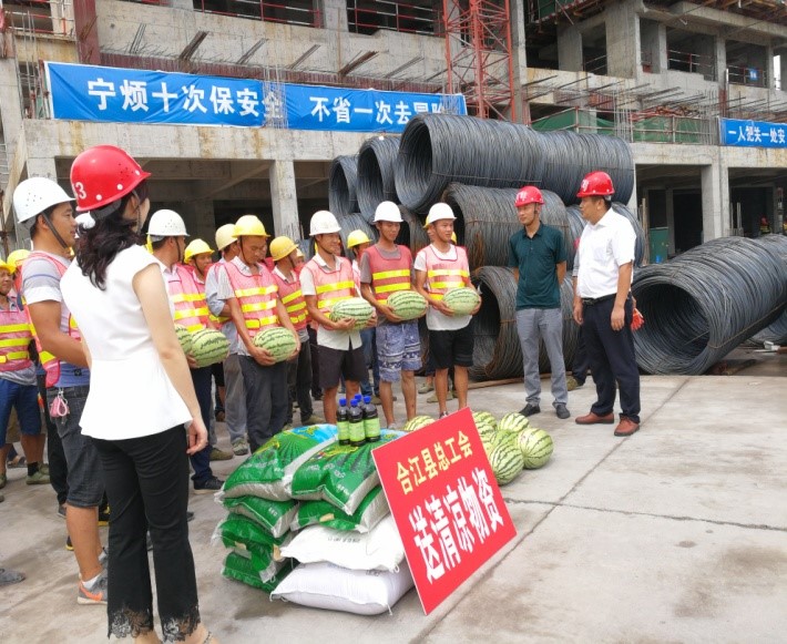 2019年8月5日下午,縣總工會會同城投公司、鑫晟公司、廣源達公司到鑫晟學府項目開展送“清涼”活動??h工會領導一行對建筑工人表示慰問,并為他們送上藿香正氣液、風油精、西瓜、綠豆、白糖等降暑防暑物品。