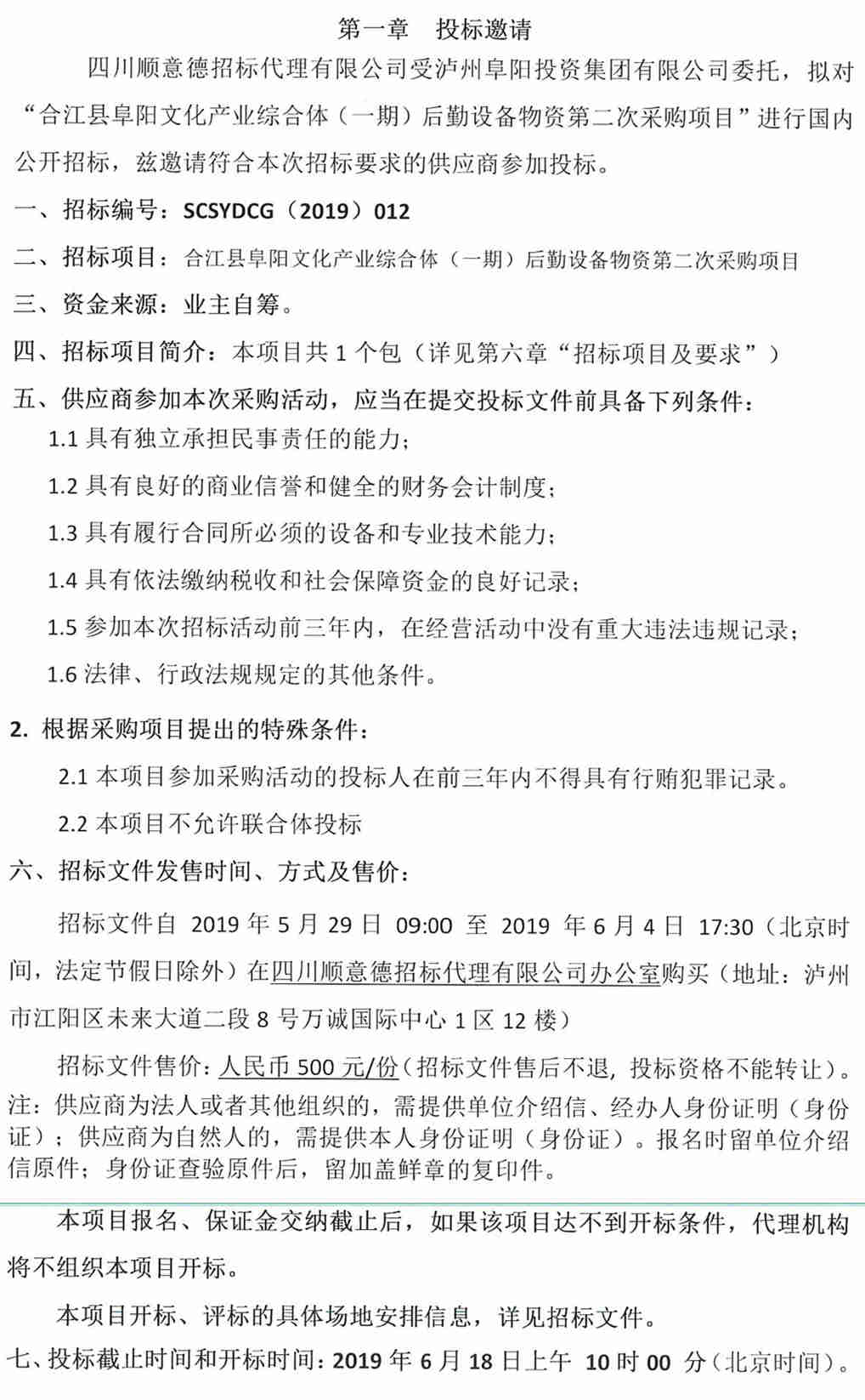 合江縣阜陽文化產(chǎn)業(yè)綜合體(一期)后勤設(shè)備物資第二次采購項(xiàng)目