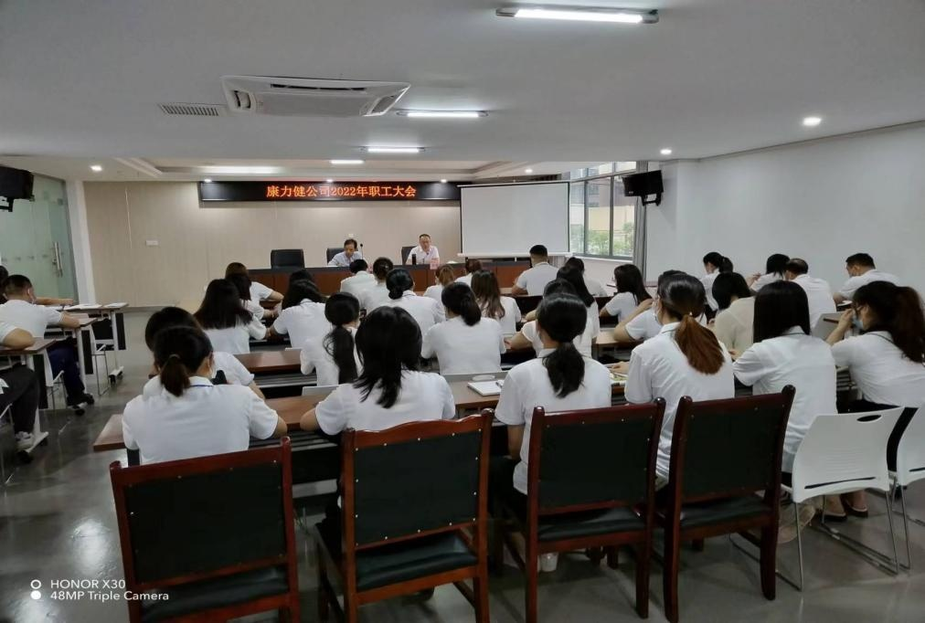 2022 年 6 月 27 日上午,瀘州康力健醫(yī)療投資有限公司 在 公 司 大 會 議 室 舉 行 2022 年 職 工 大 會 。 公 司 董 事 長 胡 天 華 、 總經(jīng)理鄭世來出席了大會, 并在大會上發(fā)表重要講話。 本次 大會分為上半年工作總結(jié)、 下半年工作計(jì)劃及安全生產(chǎn)會議 三個(gè)部分, 旨在總結(jié)公司上半年的發(fā)展情況, 完善下半年的 發(fā)展計(jì)劃及 “ 對標(biāo)找差、提能增效 ” 活動開展情況,鄭世來總 經(jīng)理提出 : 一是要理清業(yè)務(wù)工作思路,對目標(biāo)任務(wù)高標(biāo)準(zhǔn)嚴(yán) 要求的貫徹執(zhí)行;二是要強(qiáng)化落實(shí) “ 兩個(gè)責(zé)任 ” ,抓好黨的建 設(shè)和企業(yè)管理。 將組織相關(guān)人員不定期對公司各崗位履職情 況進(jìn)行檢查監(jiān)督, 發(fā)現(xiàn)問題, 立即指出督促整改到位, 建立 健全各項(xiàng)規(guī)章制度, 以制度管人, 推動公司各職能部門履職 盡責(zé), 提升公司盈利能力和盈利水平, 并對廉潔從業(yè)及安全 生產(chǎn)管理制度進(jìn)行了的宣講。