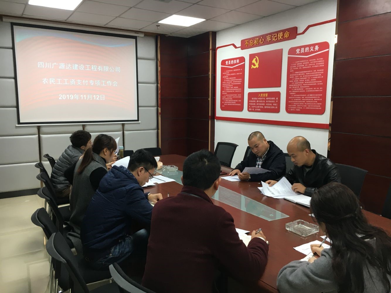 2019年11月12日,四川廣源達(dá)建設(shè)工程有限公司譙棣升董事長主持召開農(nóng)民工工資支付專項(xiàng)工作會,公司各部門負(fù)責(zé)人、項(xiàng)目經(jīng)理參會。